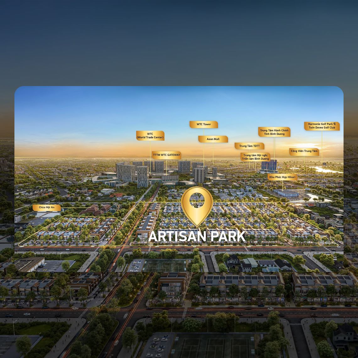 Artisan Park, một cộng đồng thương nhân và cư dân sôi động, tràn đầy sức sống, một không gian xanh với kiến trúc đương đại kiến tạo bởi Gamuda Land. Là nơi hội tụ những nghệ nhân nhiệt huyết mong muốn mang những sản phẩm độc đáo và tinh tế đến cho cộng đồng nơi đây và Thành phố mới Bình Dương.